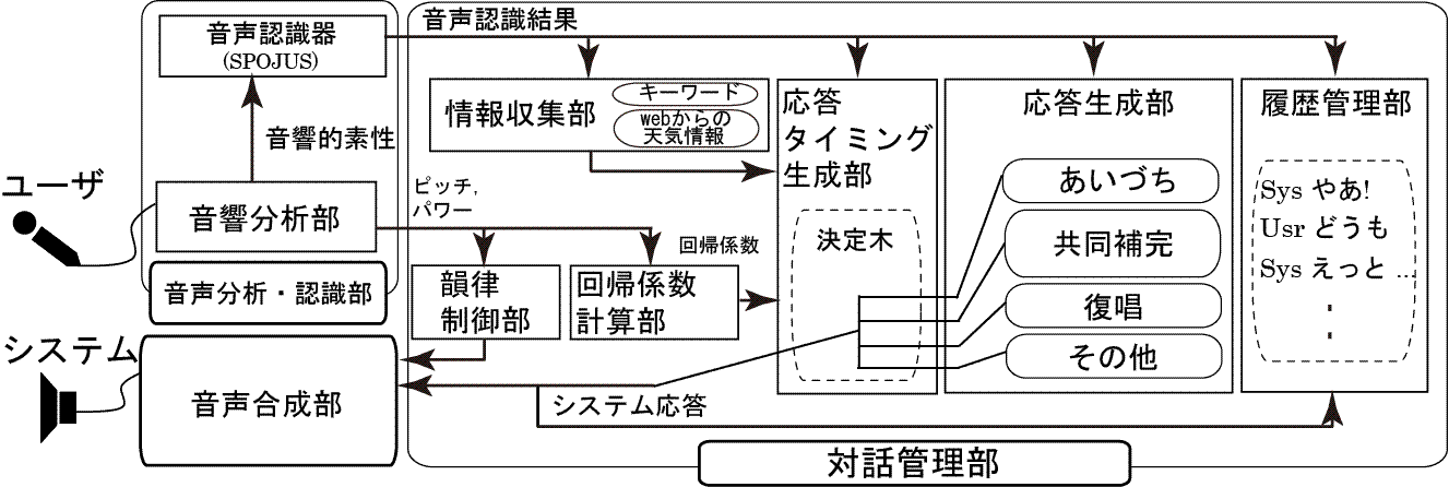 研究内容人間とシステムとの間で対話自体を楽しむことが出来るような自然な対話システムの実現を目指しています.システムの例として,現在動作しているものを以下に紹介します. 動画1:システムの動作例 システムの概略図を以下に示します. ![]() 図1:システムの概略図 システムの特徴としては,以下の事柄があります. (1)リアルタイムに応答タイミングを検出し,種々の雑談現象を扱い応答する タイミングの検出と応答の種類の決定には決定木を用いている.決定木は,応答を返すか否かを逐次的(100ms間隔)に判定しており,応答する場合には,"あいづち","復唱"や"情報提供"などの応答現象の中から,どの応答が適切かを判断し決定する.この決定木の学習には,実際の人間同士の対話を収録したデータ(コーパス)を用いている.また,学習に用いる素性としては,音声のピッチ(高さ)・パワー(大きさ)の傾きや,ユーザの発話長,ポーズ長などの韻律情報を利用している. (2)応答を出力する際の韻律情報は,ユーザに同調を示すように制御する 韻律制御については,人間同士の対話中の両話者の韻律変化について調査・分析した.その結果,変化の仕方と対話の盛り上がりに相関があることが分かった為,これをモデル化しシステムに実装した.このモデルにより,応答音声の韻律をユーザに同調させることで,ユーザに対して同調性を示し,対話がより円滑に進むようにしている. (3)その他の雑談現象への対応 この対話システムは,ユーザとシステムの混合主導で対話を進めることができる.また,システムは,応答するべきタイミングであるかを逐次的に監視しており,このことからオーバーラップした応答も返すことが可能になっている.また,ユーザからシステムへの割り込み発話(バージイン)も扱っている. 今後のアイディア・場の空気を読む手法の導入 対話中に得られる情報として,音声からの特徴や言語的な特徴の他に,画像やその他センサからの情報を元に,場の状況を捉え,その場に応じた対応を行う.これに関して,受入研究室では,言語情報と画像情報を用いて,タスク推定を行う研究が始まっている.タスクの推定は,システムがタスクの切り替えを行う場合や,ユーザに対し適切な対応を行う上で必須であり,これを用いて対話システムでのタスク制御を行うことができれば,頑健な対話を行うことができると期待される.また,雑談対話制御を行う場合や,主導権制御を行う場合にも,場の空気を読み,状況を把握することは非常に重要である. この研究項目は,今後確実に発展していくであろうユビキタス社会において,威力を発揮することが期待でき,それに先駆けて研究・開発を行うことは有意義である. ・画面表示・エージェントの作成,個性の追加 現在の対話システムでは,対話を行うのみで,キャラクタなどが表示されるということが無い.また,情報を提示する際には,音声による出力のみである為,画面表示などを行うことによって,より頑健に情報の伝達が行えるものと考えられる.表示するエージェントについても,「リアルな人間の顔」「愛嬌のあるキャラクタ」などによって違いが現れると予想されることから,これらの視覚的効果の調査・分析を行う. また,エージェントの個性・性格などを変化させることによって,ユーザにどのような印象を与えるかについても調査・分析する. ・2人のエージェントとユーザの3人対話 現在はユーザ対システムの1対1対話であるが,これを,"性格の異なる2つのエージェント(システム)とユーザとの3人対話"に拡張する.エージェント間では,実際に発話した内容以外にも,すべての情報が共有できる為,様々な対話制御が可能となり,広い応用が考えられる.例えば,あるエージェントはユーザに賛同し,一方のエージェントは反論するという対話を実現すれば,対話を盛り上げることができる. また,各エージェントの個性の差別化を図り,その違いによってユーザにどのような影響を与えるかについて,調査・分析を行う.エージェントの表示方法の違いとしては,「ロボットを用いる」「2つの画面に個別に表示する」「1つの画面に2つのエージェントを表示する」といったことが考えられる.また,エージェント間の上下関係や,ユーザ専属のエージェント,エキスパートエージェントなど知識の差別化も図る.応答タイミングや,各種応答の頻度などもエージェント毎に設け,受ける印象の違いを明らかにする. ・対話の主導権による制御 現在のシステムでの応答タイミング・応答種類決定モデルと韻律制御モデルは,主導権がどちらにあるかという点は考慮されていない.しかし,実際の対話においては,主導権が大きな役割を果し,対話の主導権をどちらが持っているかということと,応答タイミング/韻律制御には関連があると思われる.この点において調査分析し,対話の主導権とモデルの対応を検証する必要がある.人間同士の対話において,主導権を持っている側とそうでない側で,どのように対話を行っているかを調査・分析し,それぞれの場合について,個別にモデルを学